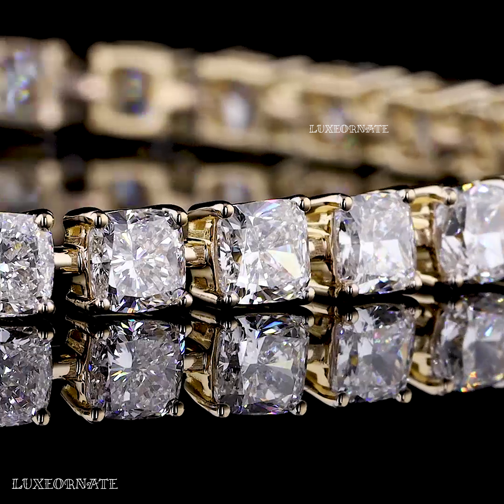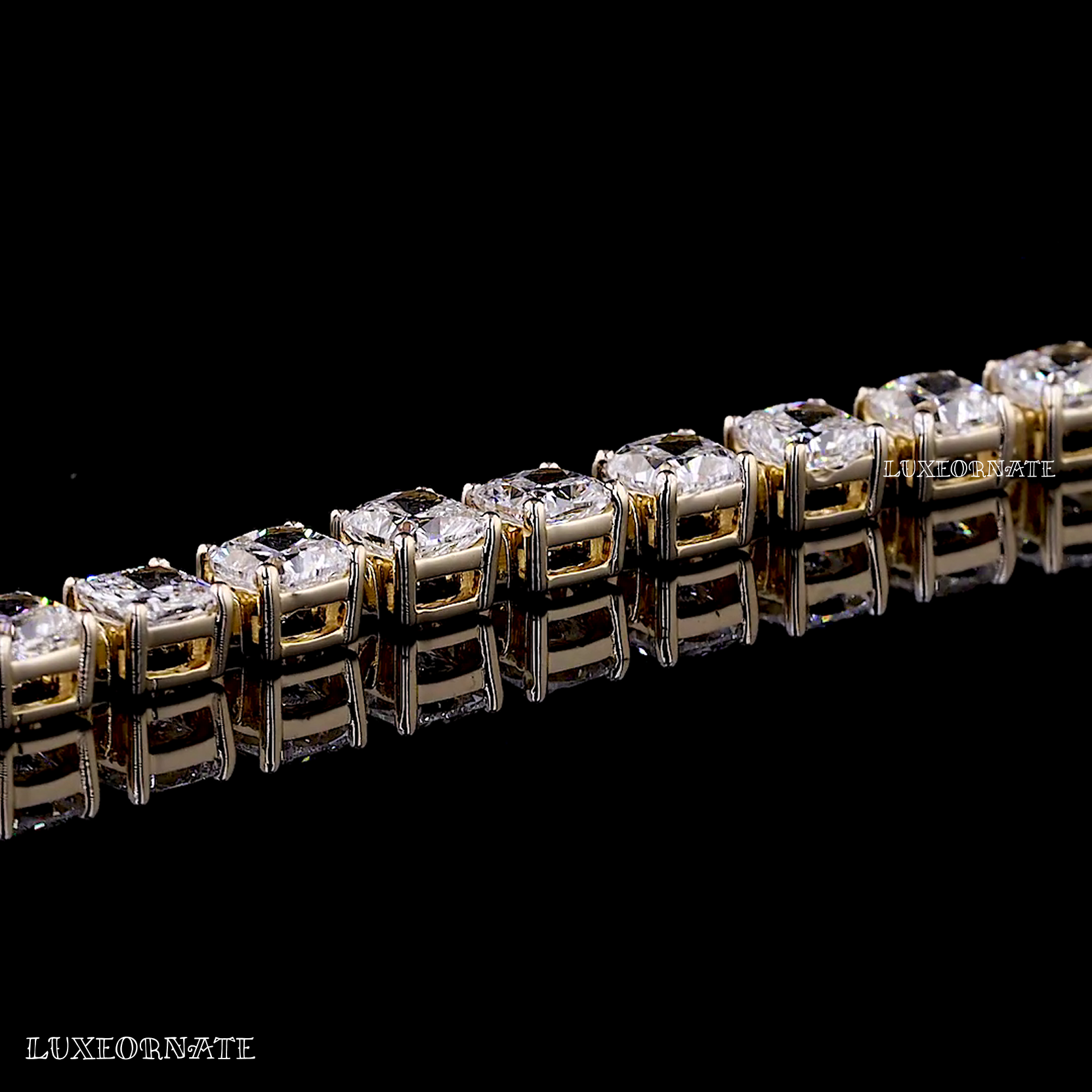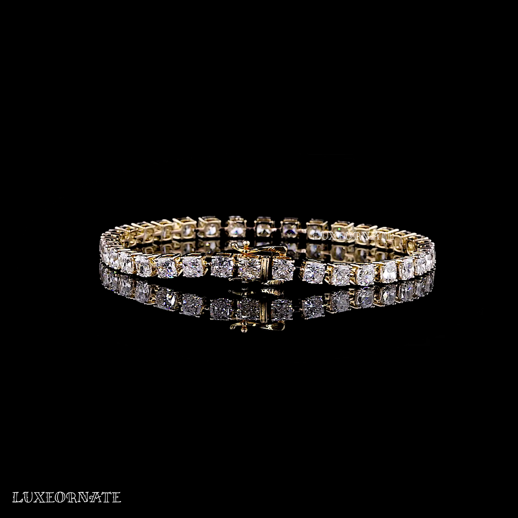 Experience timeless elegance with the Luxeornate Classic Cushion cut Diamond Tennis Bracelet, designed to deliver pure brilliance in every movement. Each square cut diamond is meticulously set in a polished 14k yellow gold frame, creating a seamless ribbon of sparkle around the wrist.