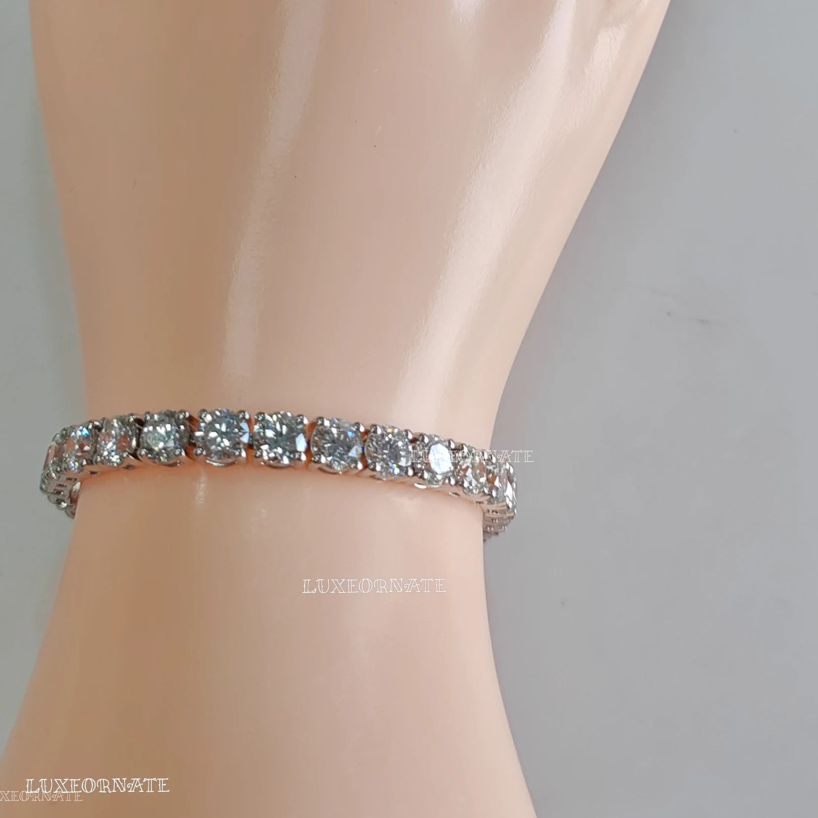 This elegant diamond tennis bracelet features a continuous line of brilliant round cut diamonds set in a sleek white gold finish. Designed for timeless sophistication, its secure prong setting enhances sparkle while ensuring all day comfort. Perfect for weddings, gifting, parties, and everyday luxury wear.