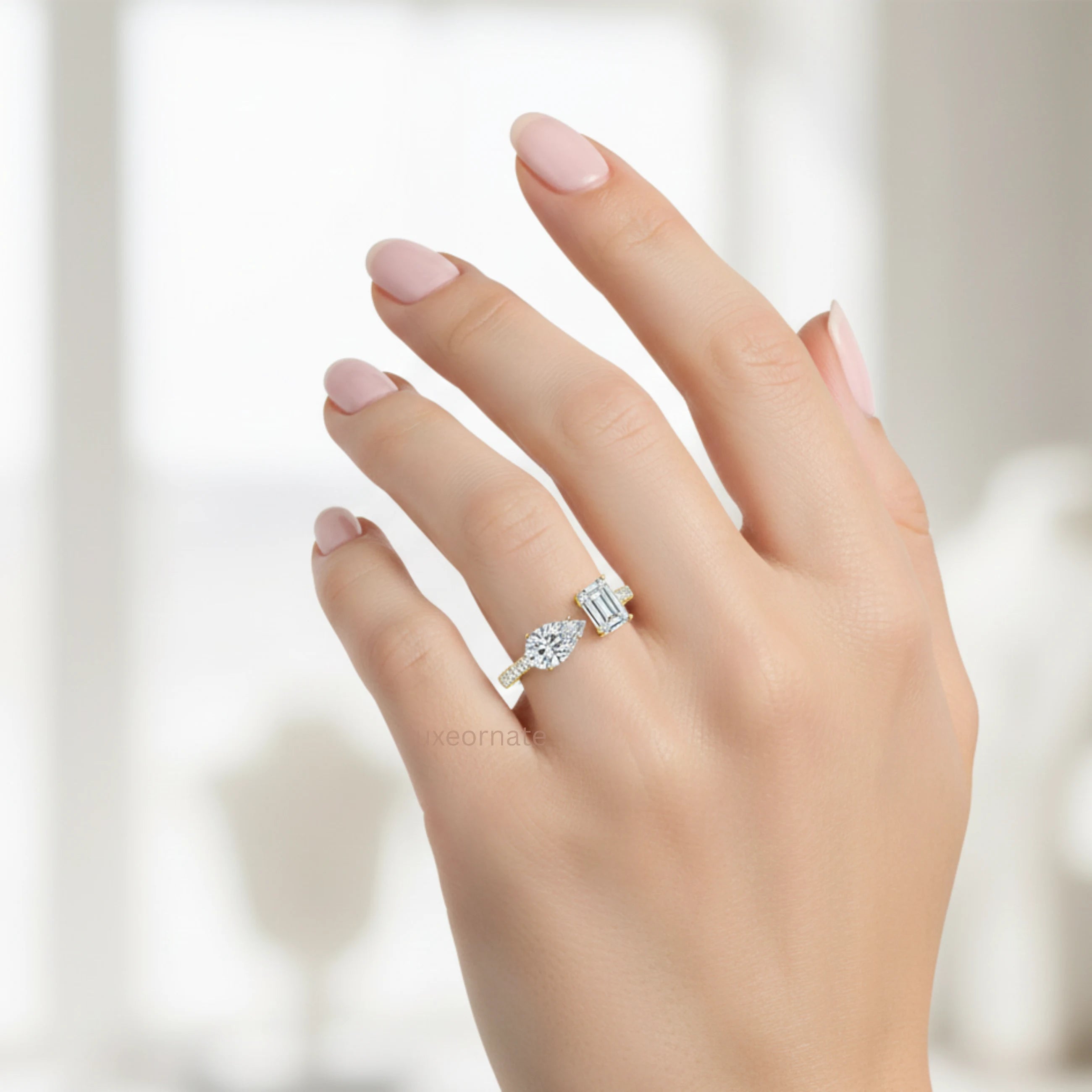 A luxurious Toi Et Moi ring featuring a pear cut and emerald cut lab grown diamond set in rich 14K yellow gold. Symbolizing two souls and one bond, this modern engagement ring sparkles with timeless romance, perfect for proposals, anniversaries, and meaningful gifting.