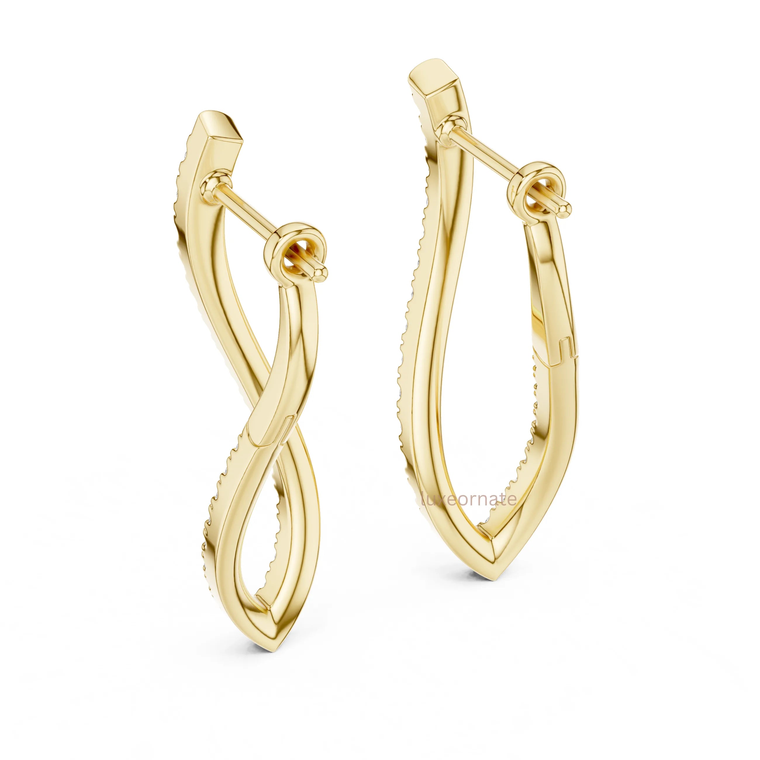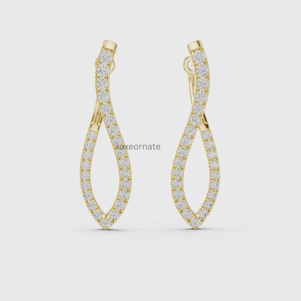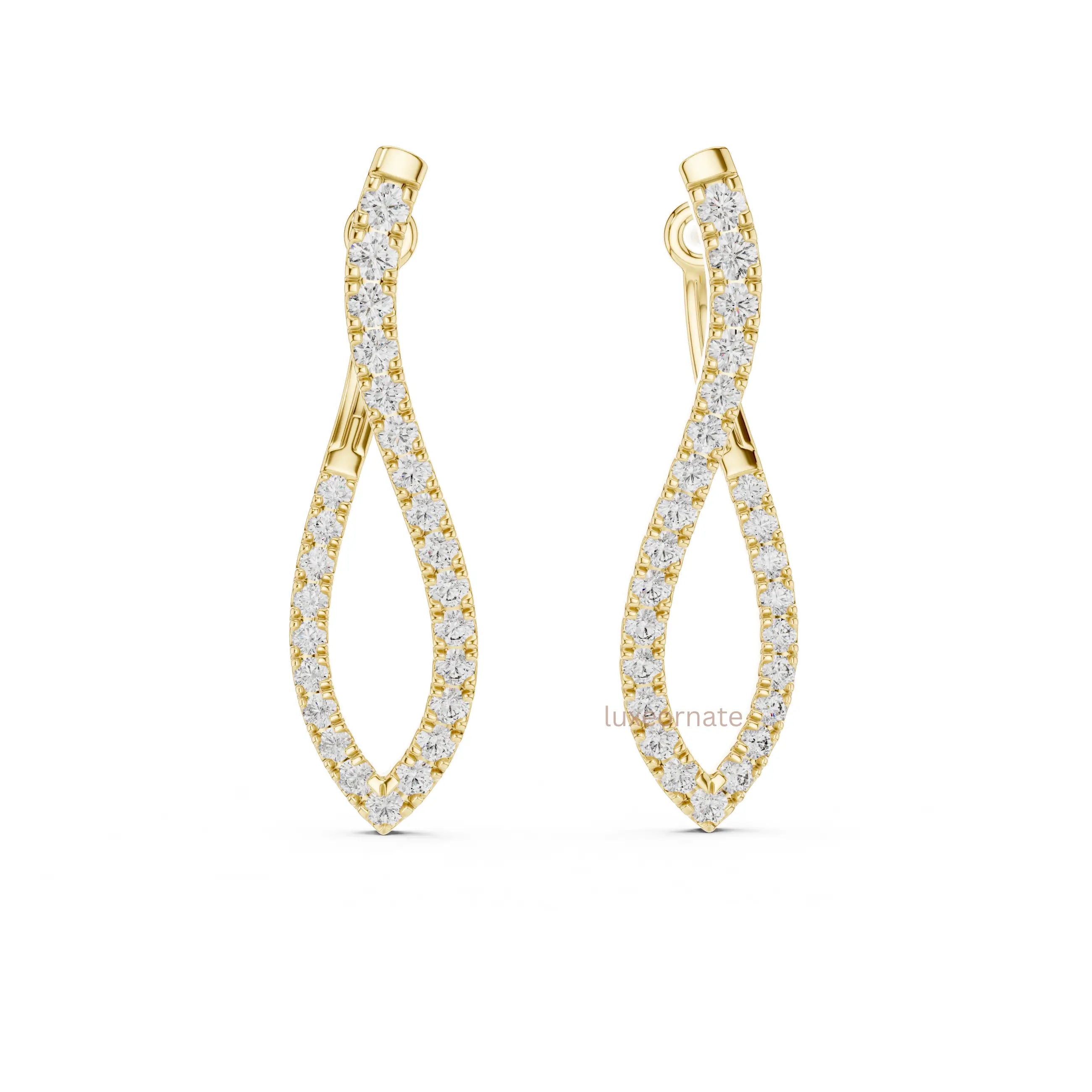 The Twist Line Diamond Drop Earrings showcase graceful movement and modern elegance through a softly twisted silhouette. Crafted in warm rose gold, these earrings feature a flowing open drop design lined with shimmering round brilliant diamonds. The gentle curve creates a flattering, elongated look while allowing light to reflect beautifully from every angle.