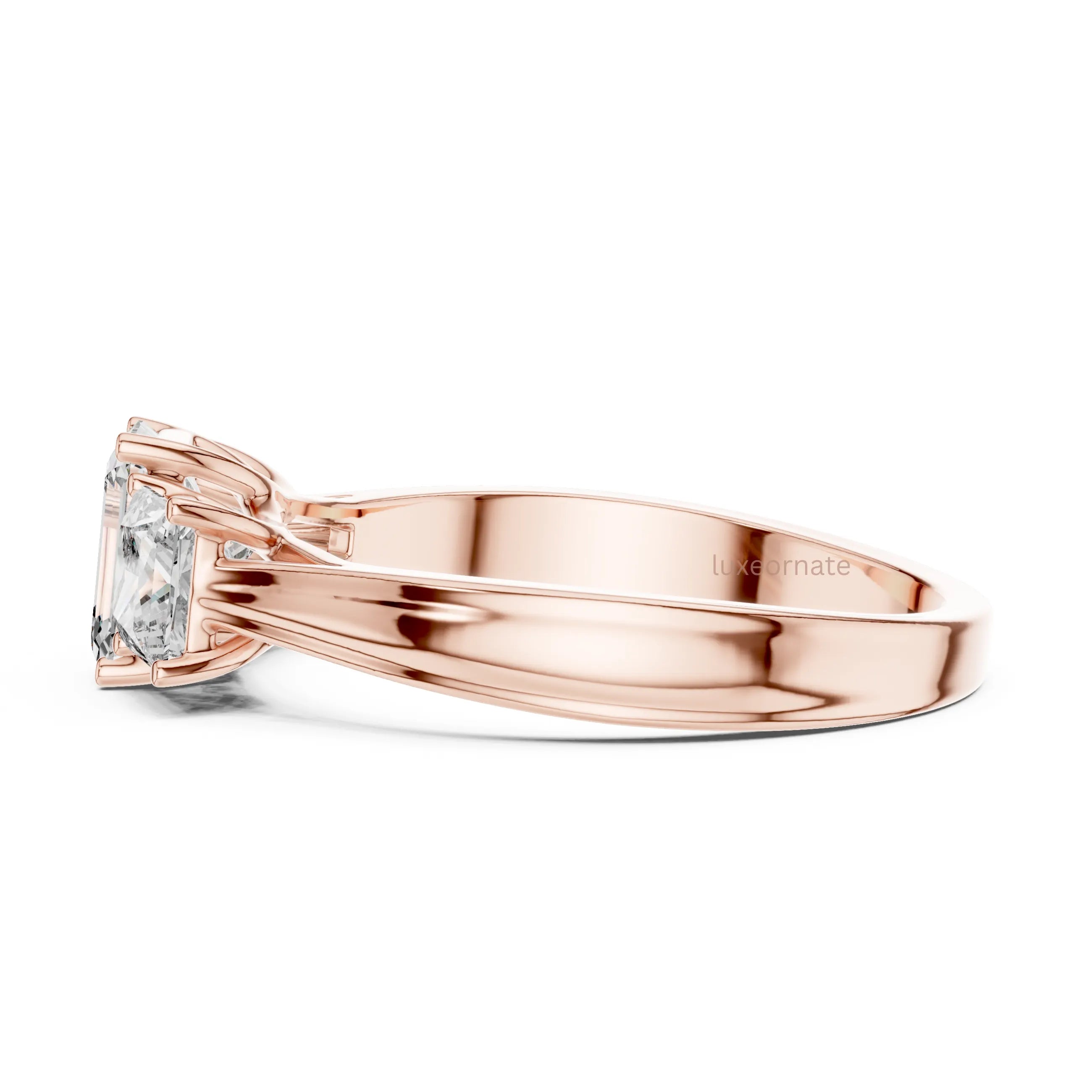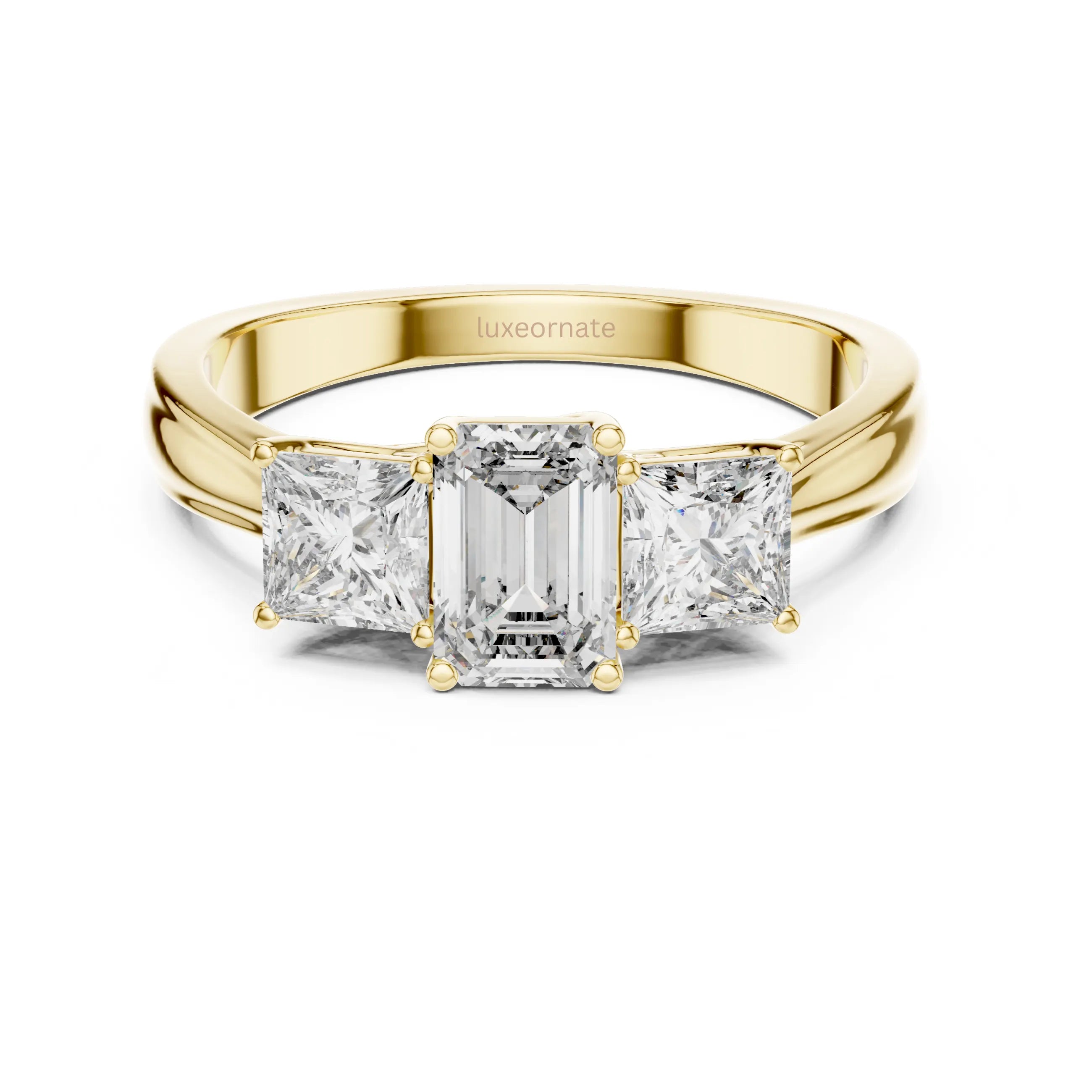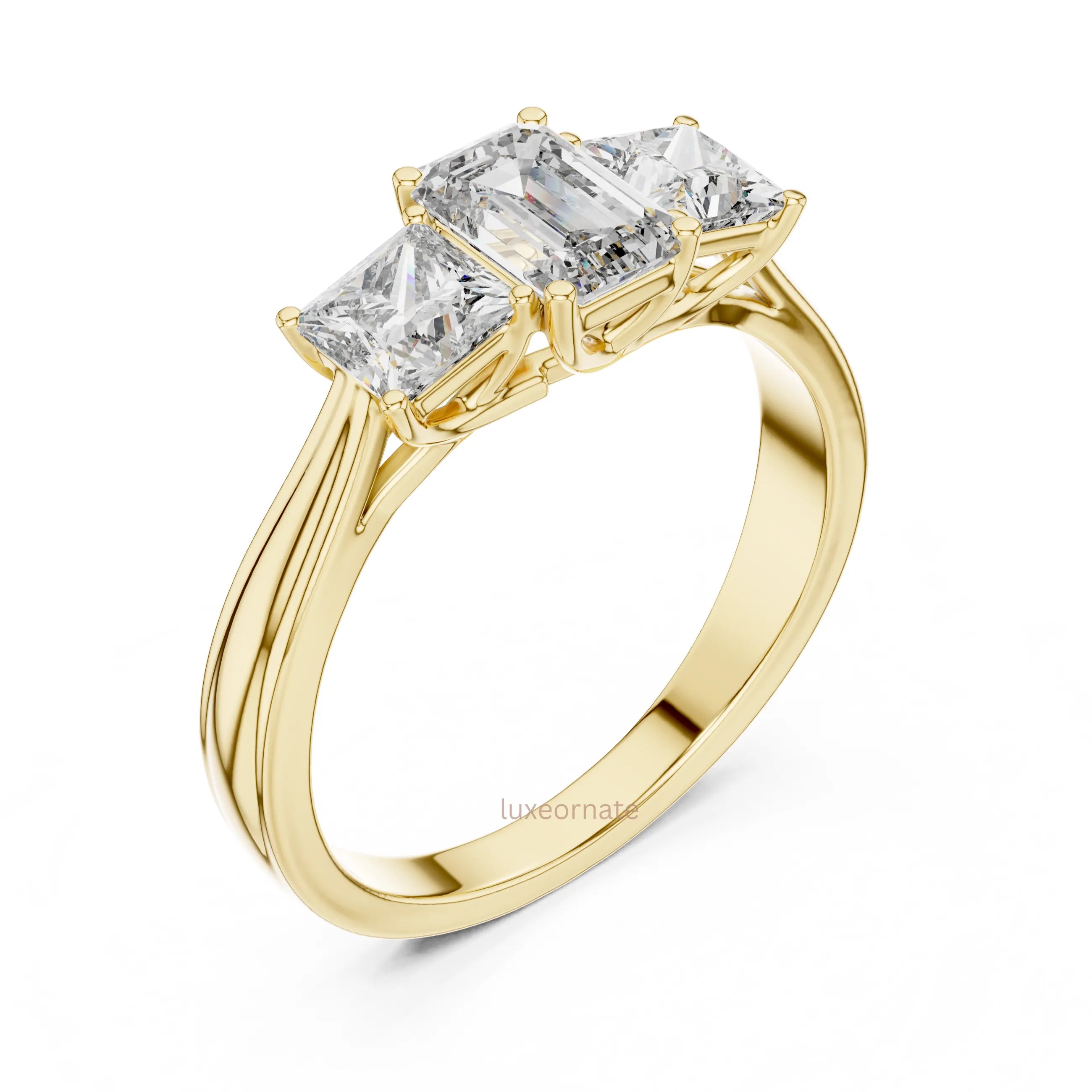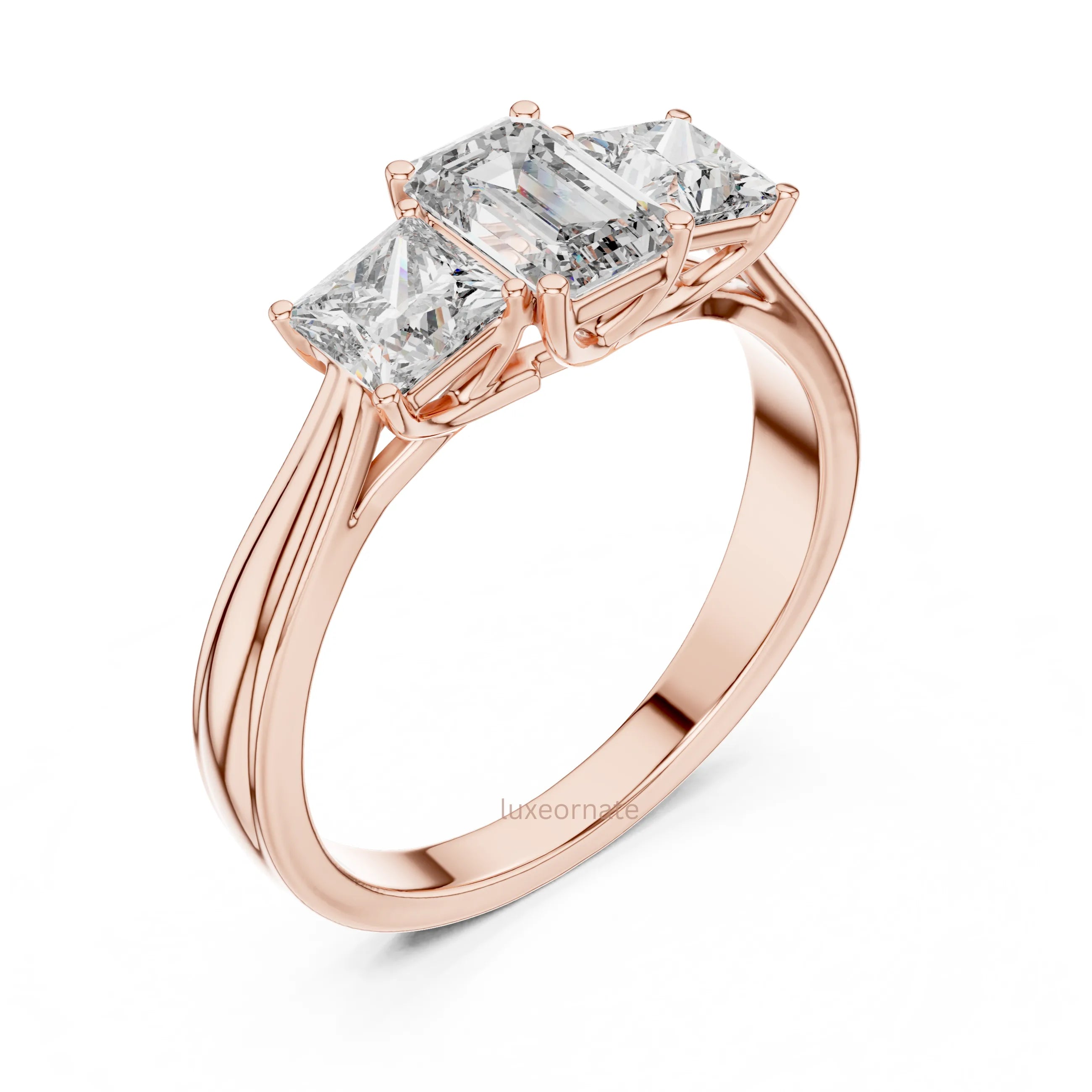 The Trinity Radiance Emerald & Princess Cut Diamond Ring is a refined expression of timeless elegance and modern design. At its heart, a striking emerald cut diamond commands attention with its clean lines and step cut brilliance, while two perfectly matched princess cut diamonds add symmetry and sparkle on either side.