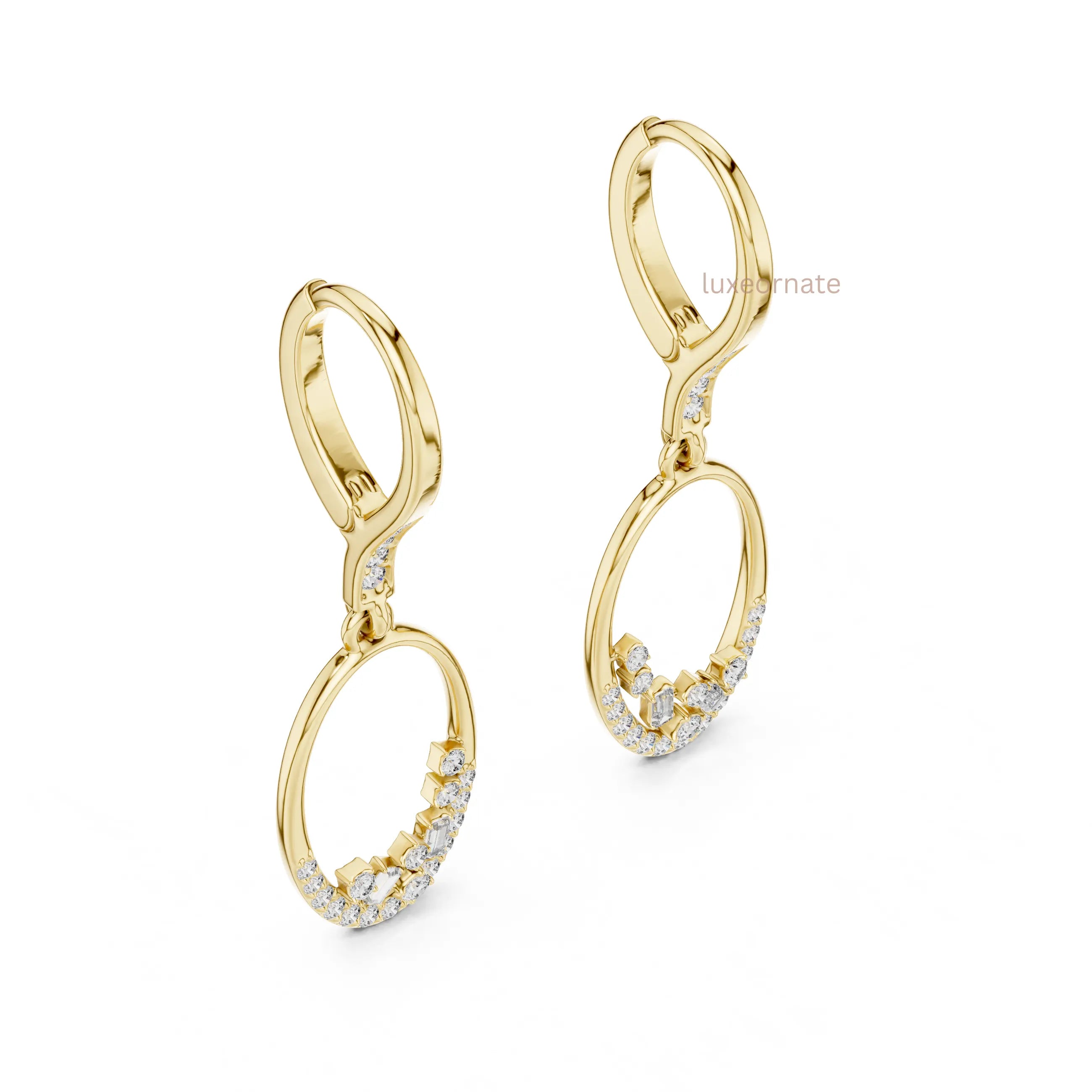 The Aurora Fancy shhape Diamond Drop Earrings blend modern elegance with timeless sparkle. Featuring a sleek drop silhouette accented with brilliant round and baguette cut diamonds, these earrings create graceful movement and refined brilliance. The slim diamond set lever back adds a subtle shimmer, making them perfect for both everyday luxury and special occasions.
