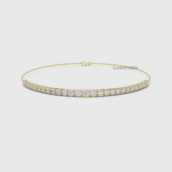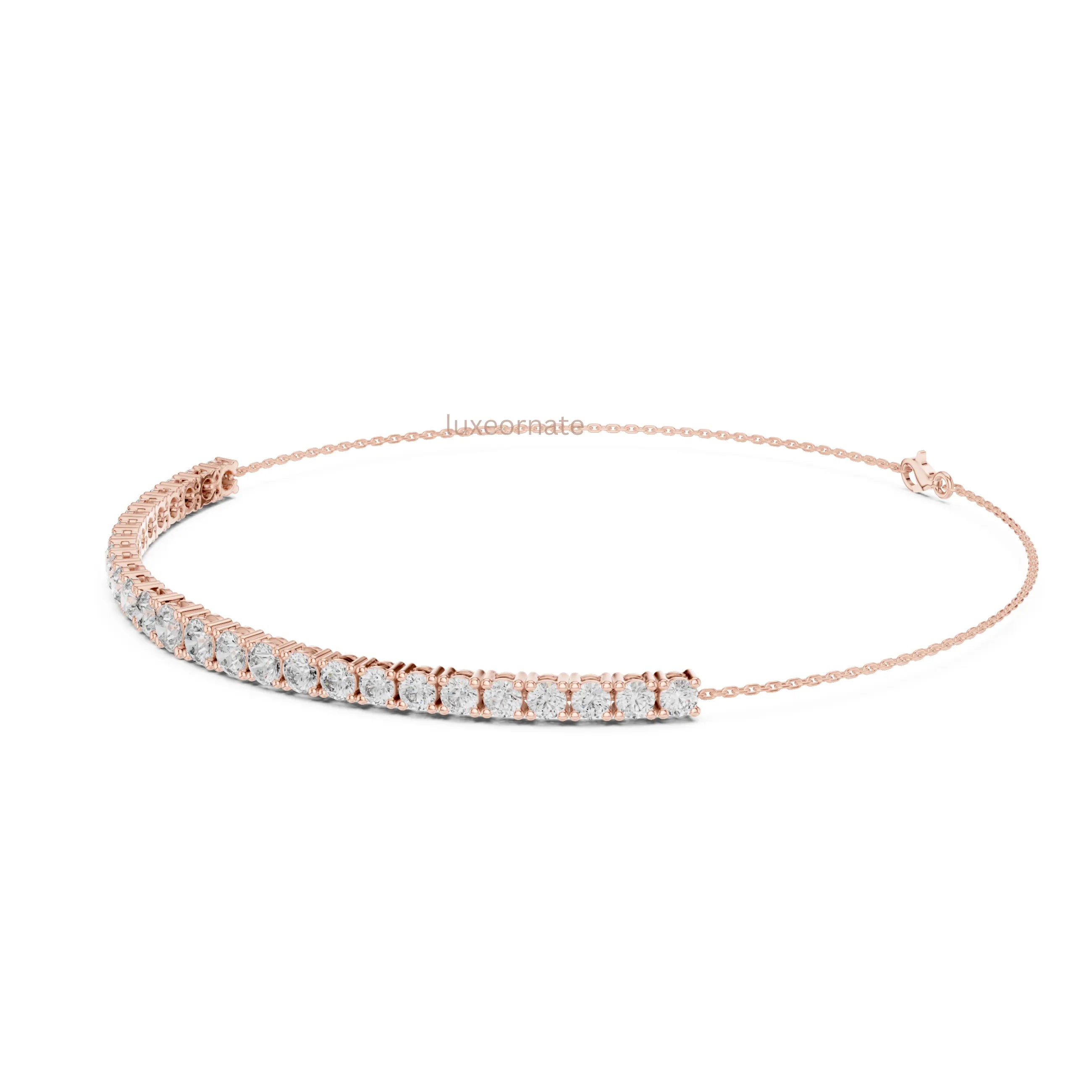 The Celestia Fine Line Diamond Chain Bracelet is a graceful expression of modern minimalism and timeless sophistication. Designed with a slim, elegant profile, this bracelet showcases a perfectly aligned row of round brilliant lab grown diamonds, seamlessly integrated into a fine rose gold chain. The slender diamond line creates a subtle yet radiant sparkle, while the lightweight chain offers exceptional comfort and fluid movement on the wrist. Finished with a secure clasp, this bracelet is ideal for everyday wear, layering, or adding a refined touch to special occasions.