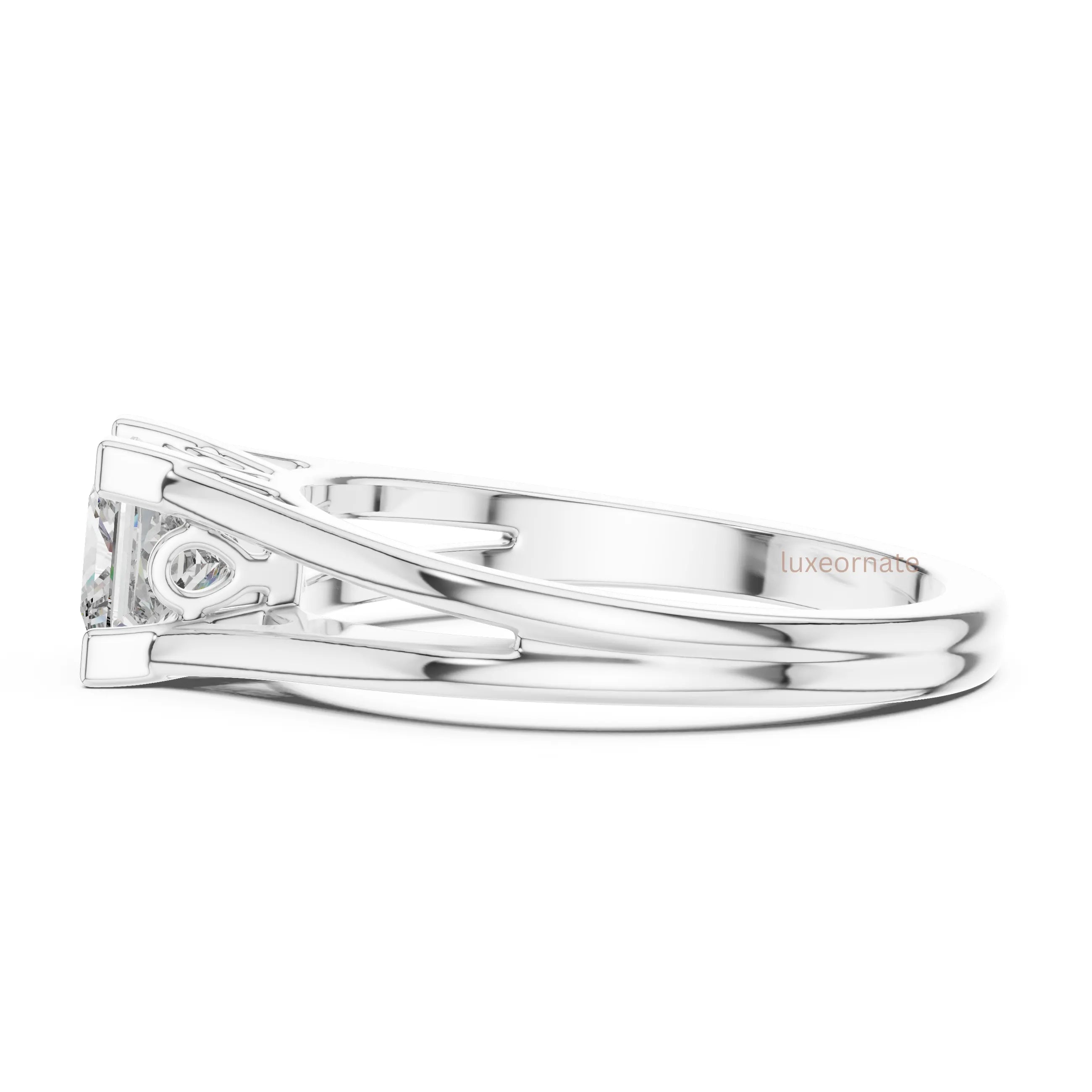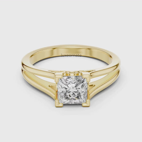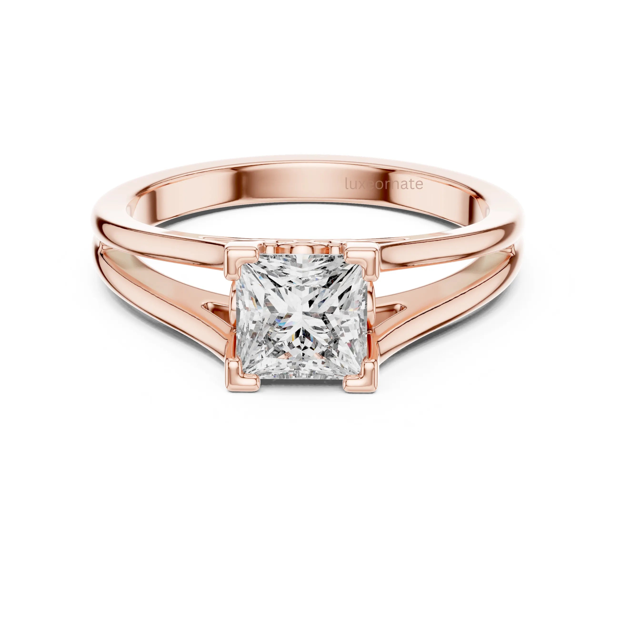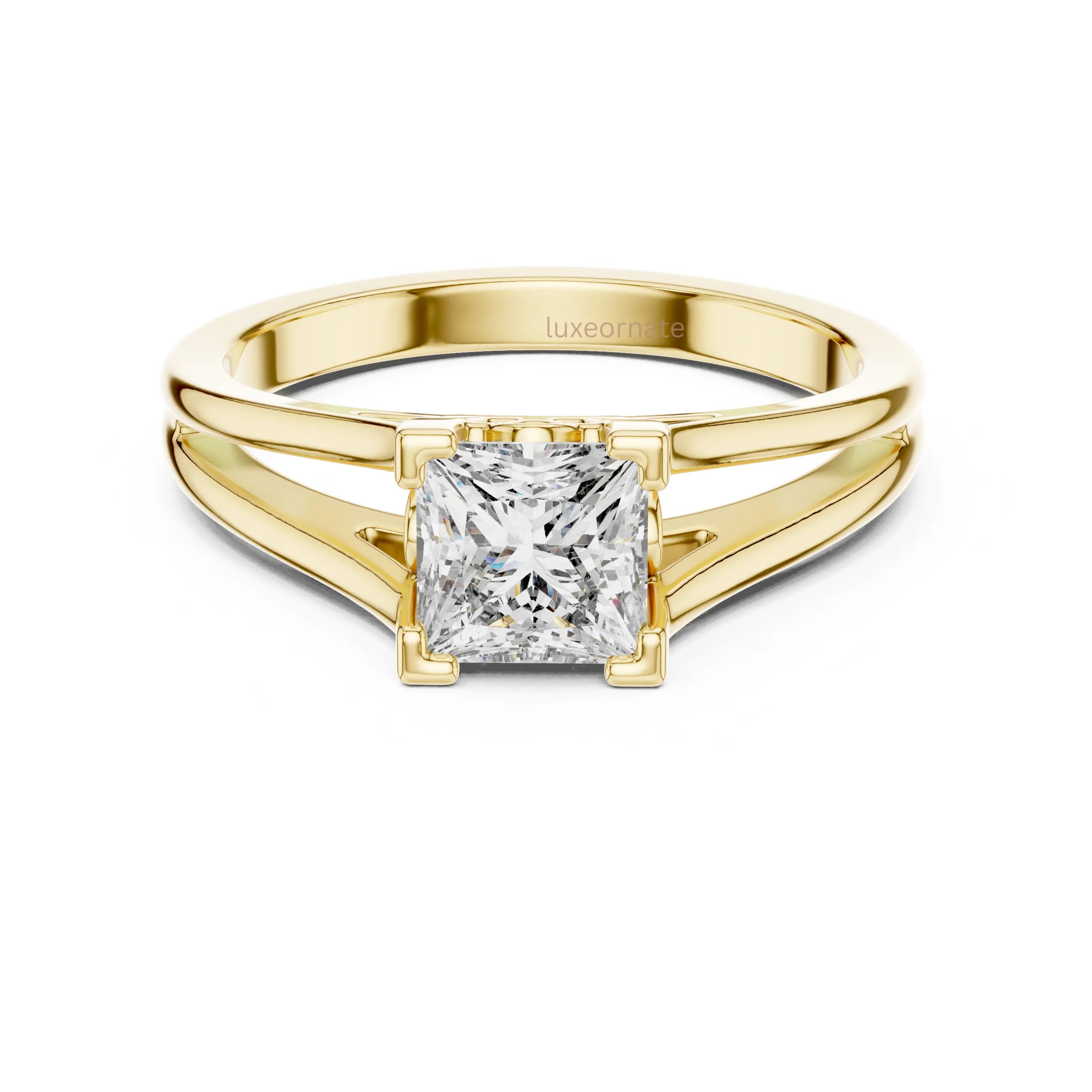 Softly elegant and beautifully refined, the Dulce Princess Diamond Ring features a dazzling princess cut diamond secured in a four prong setting for radiant brilliance. Crafted in polished yellow, rose, or white gold, its graceful split shank band enhances the center stone while offering exceptional comfort. perfect for engagements and timeless miles tones.