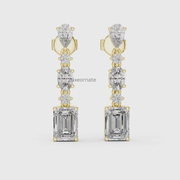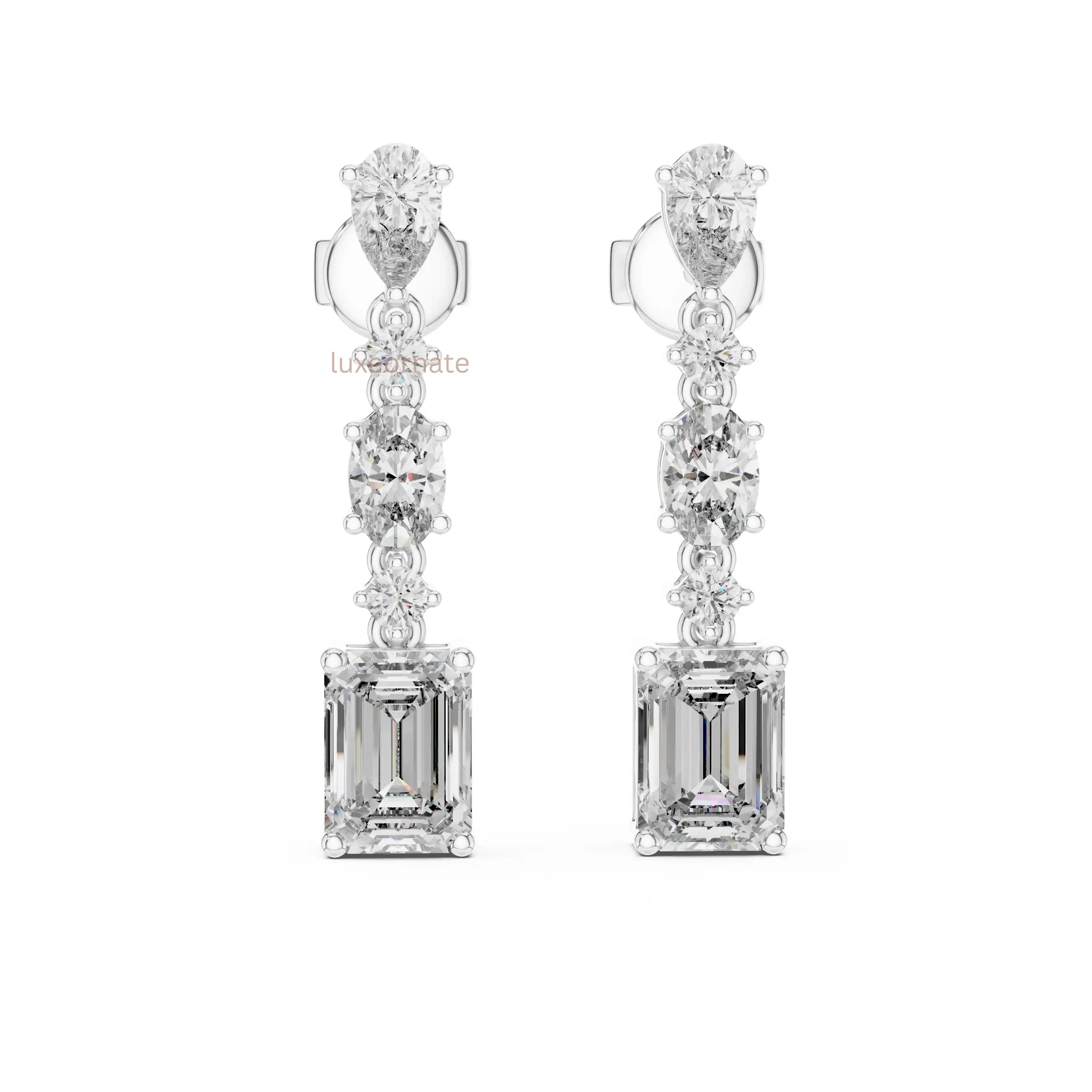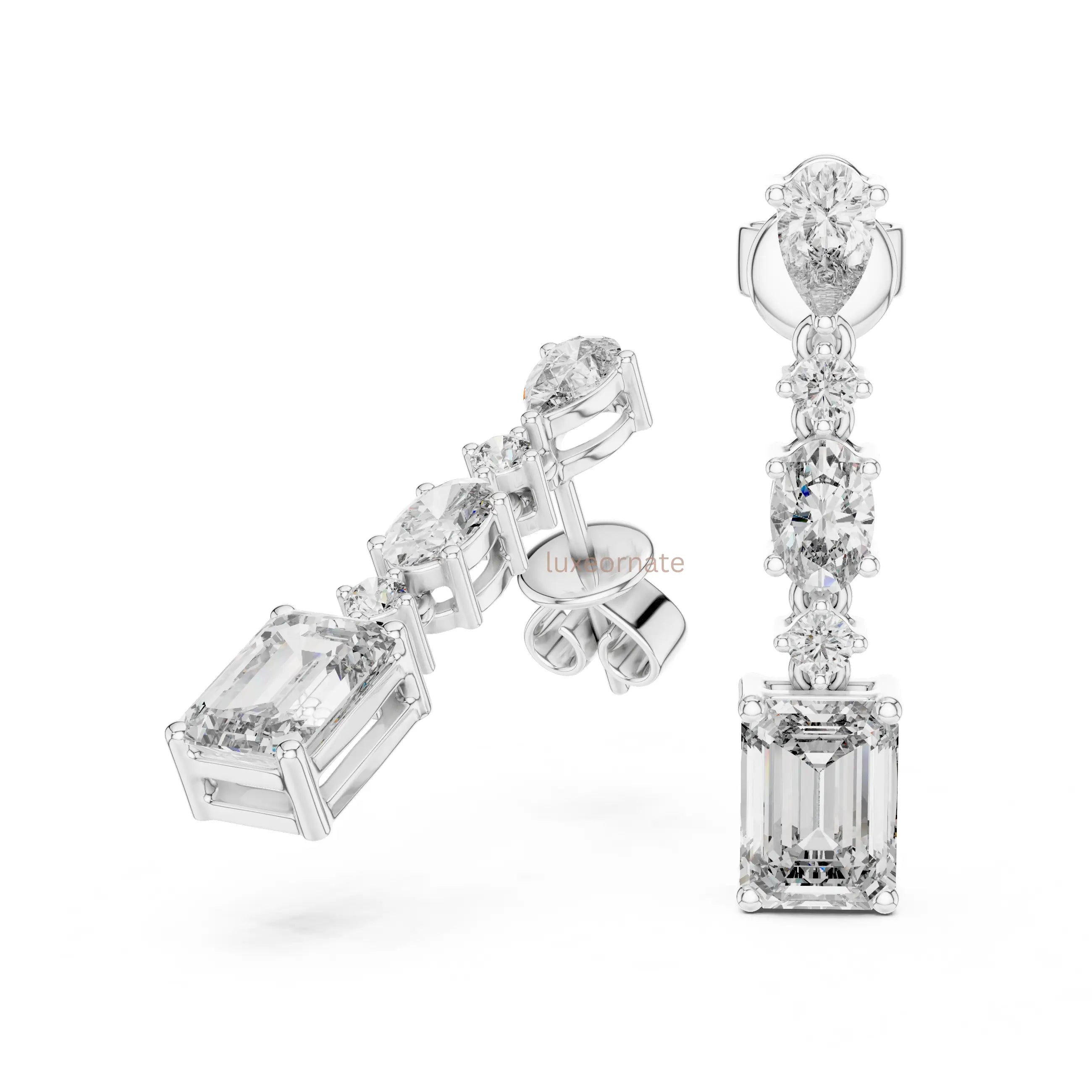 Indulge in refined luxury with the Elegant Fancy Shape Lab Grown Diamond Dangle Earring, a breathtaking design that celebrates brilliance through perfectly balanced fancy cut diamonds. This exquisite pair features a pear cut diamond at the top, followed by a graceful cascade of oval and round brilliant diamonds, finishing with a striking emerald cut diamond drop.