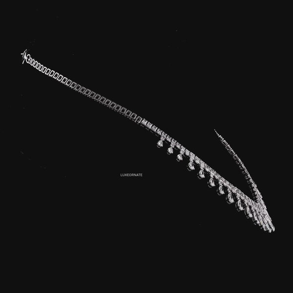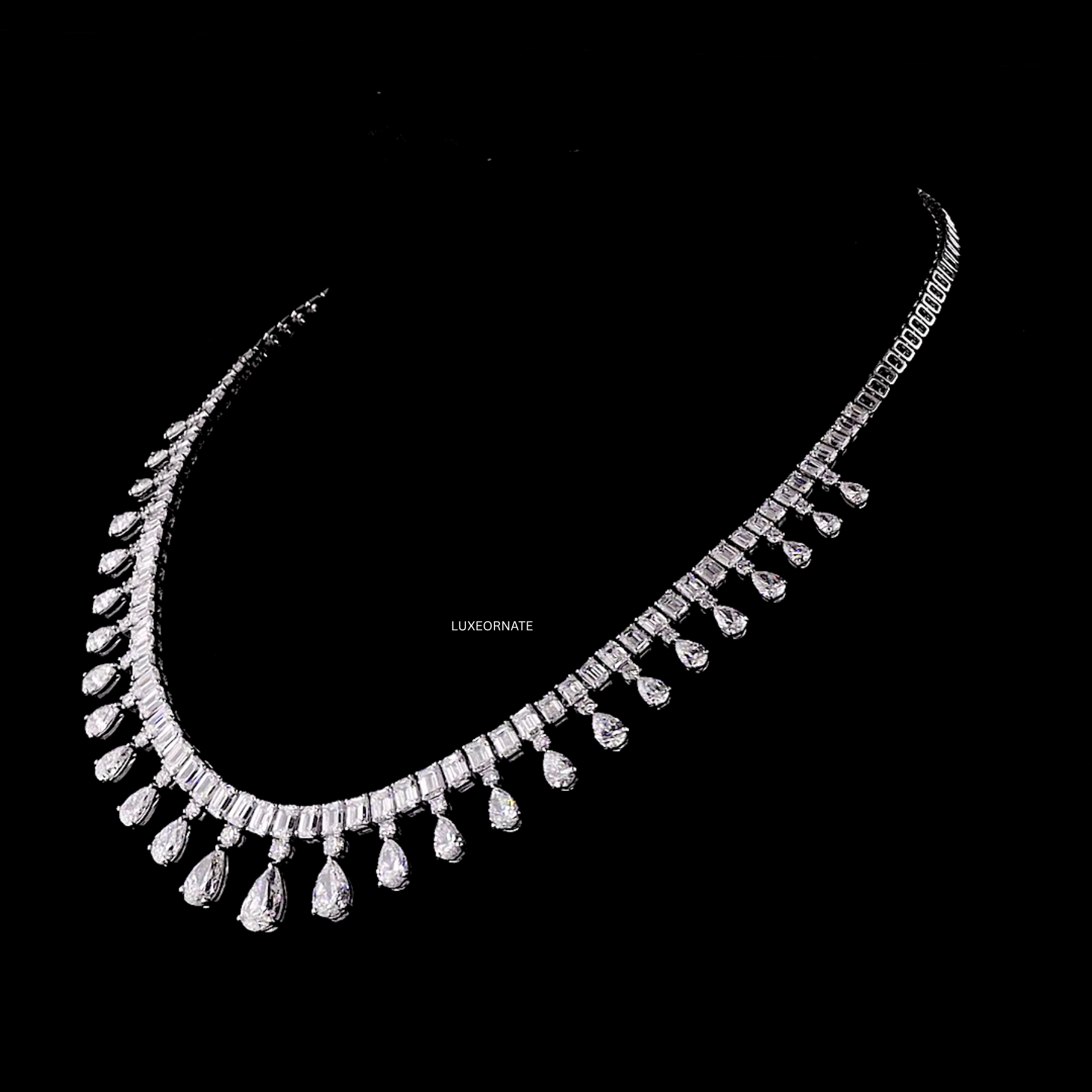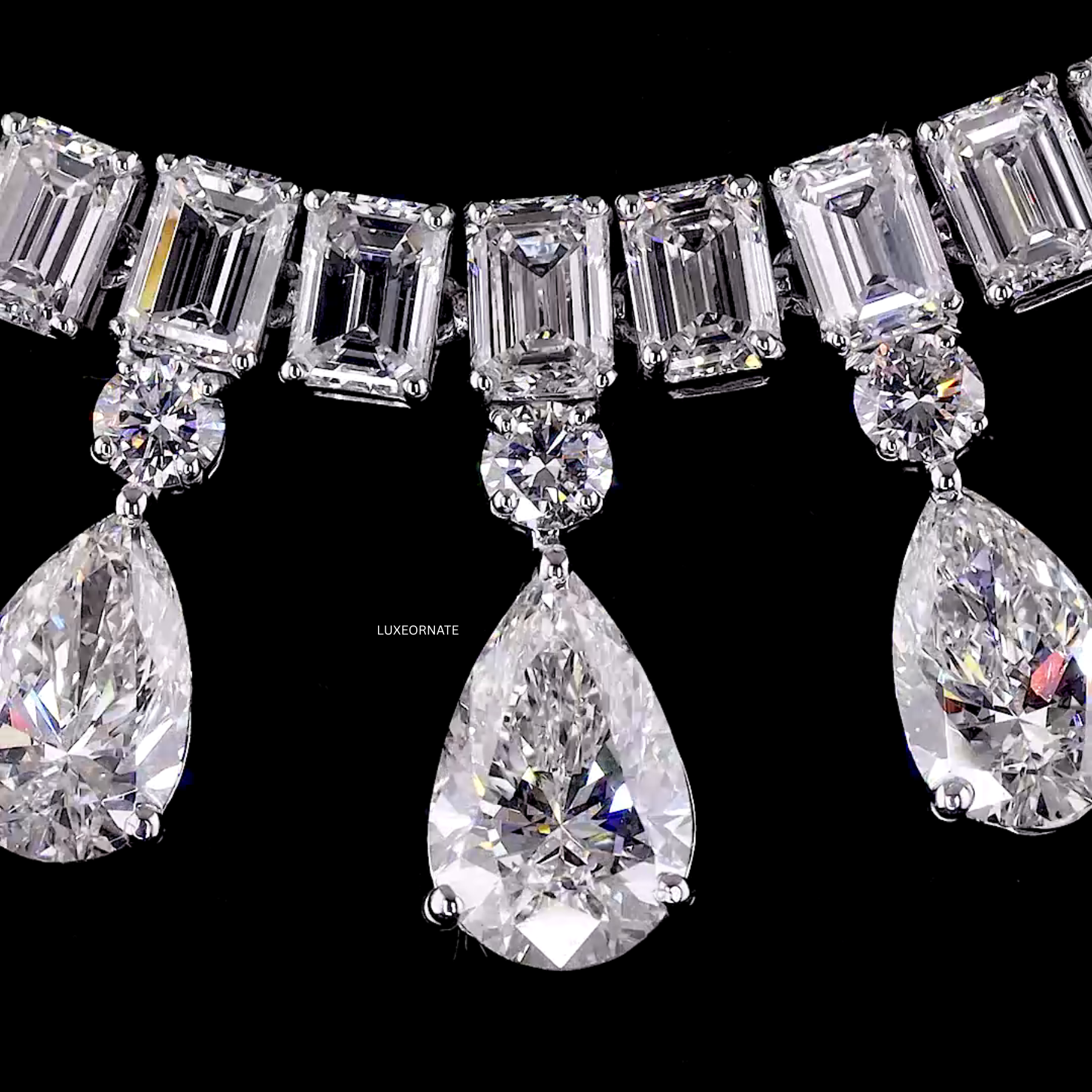 Indulge in exquisite sophistication with the Elegant Pear Drop Emerald Lab Grown Diamond Necklace, a breathtaking fusion of timeless charm and modern luxury. This masterpiece features radiant pear shaped emerald stones gracefully suspended from a sleek row of shimmering lab grown diamonds, creating a captivating contrast of rich green hues and brilliant sparkle.
