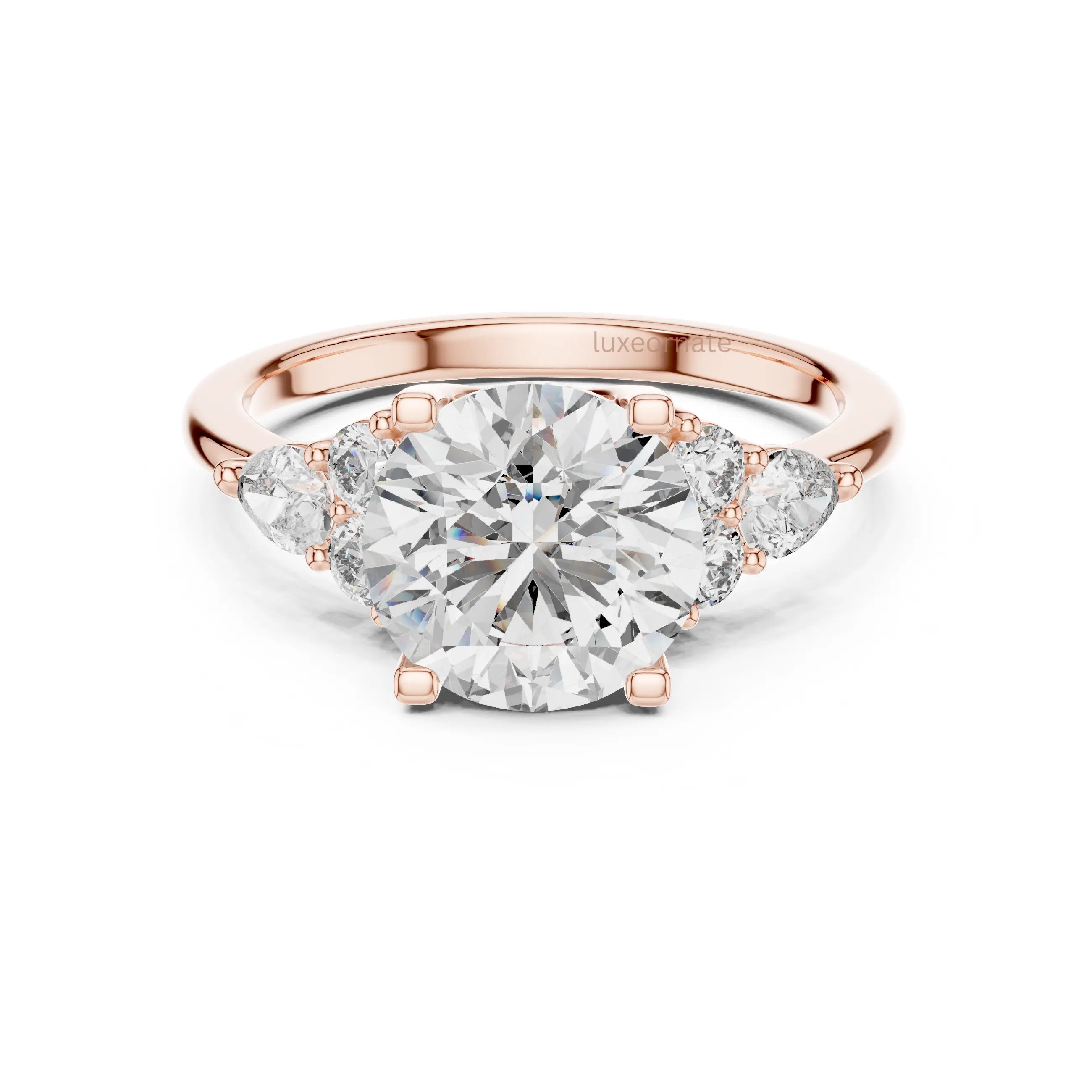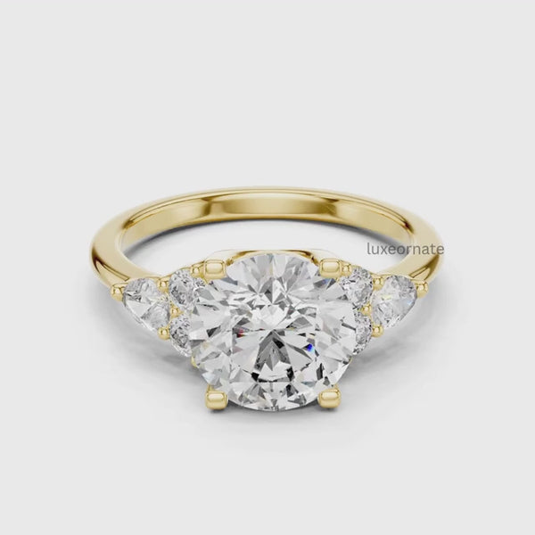 A timeless symbol of elegance and brilliance, the Eternal Round Lab Diamond Ring With Three Side Stone features a radiant round/pear cut lab grown diamond beautifully accented by three sparkling side stones on each shoulder, expertly set in a classic four prong setting to maximize fire and sparkle. all set in polished yellow gold for everlasting shine.