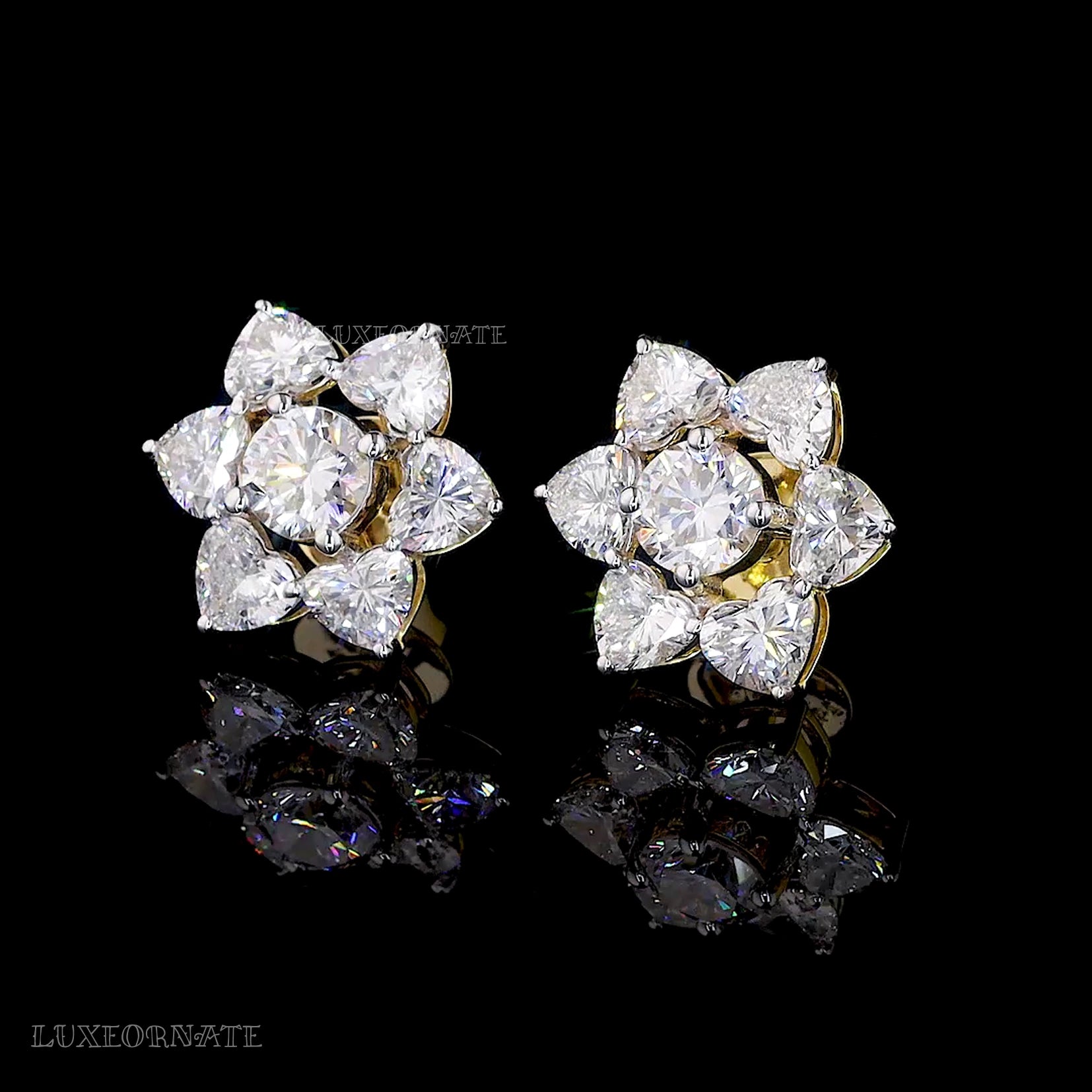 Elevate your everyday elegance with these Flower Shape Lab Grown Diamond Stud Earrings, masterfully designed to showcase modern luxury with timeless floral beauty. Featuring a radiant round cut lab grown diamond at the center, surrounded by brilliant pear shaped diamonds arranged in a delicate flower pattern, these studs sparkle from every angle with exceptional fire and clarity.