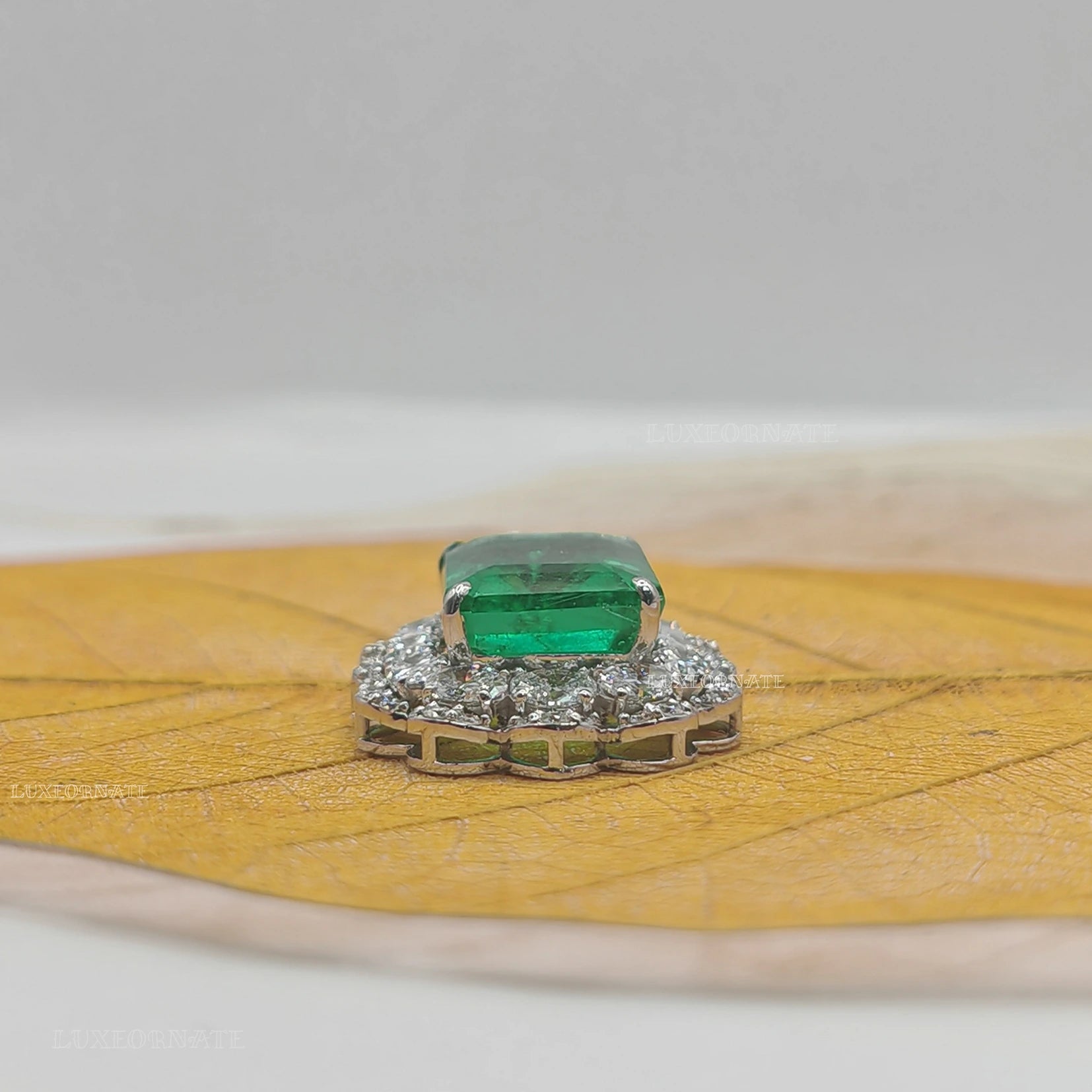 This exquisite emerald lab grown diamond pendant features a vivid rectangular emerald cut green gemstone at the center, surrounded by a luxurious floral halo of round brilliant diamonds. Crafted in high polish white metal, the pendant radiates royal elegance and timeless brilliance, making it perfect for both statement occasions and refined daily luxury.