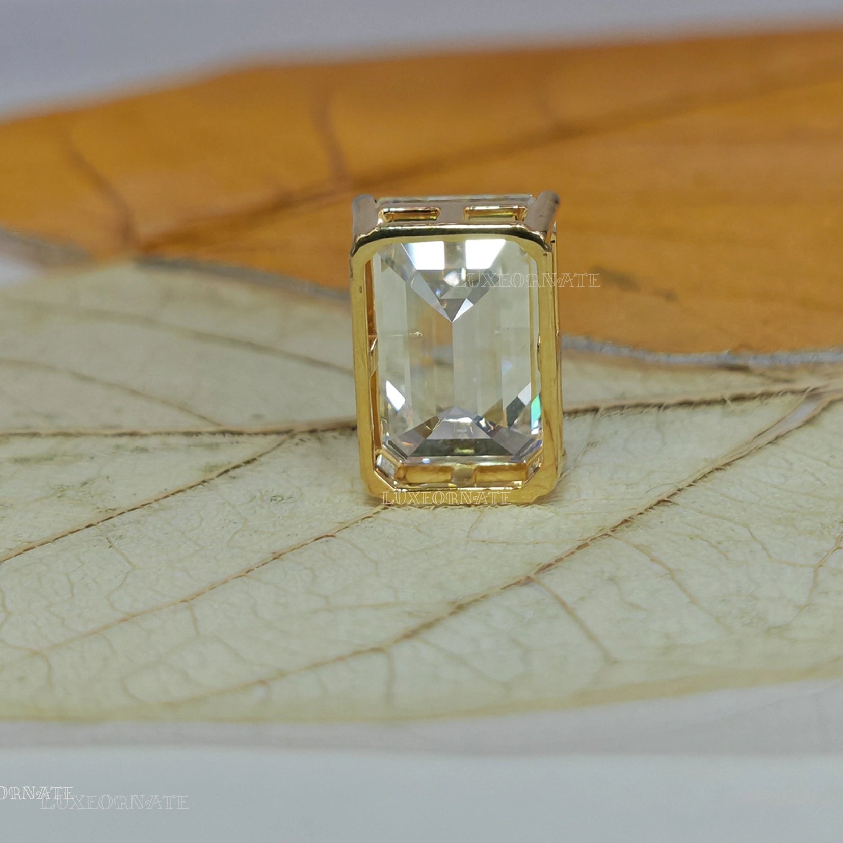 This striking solitaire diamond pendant features a large emerald cut lab grown diamond set in a contemporary open frame yellow gold mount. Designed to showcase maximum brilliance from every angle, the sleek architectural setting allows light to flow freely through the stone, creating exceptional fire and clarity. A perfect blend of modern luxury and timeless elegance.