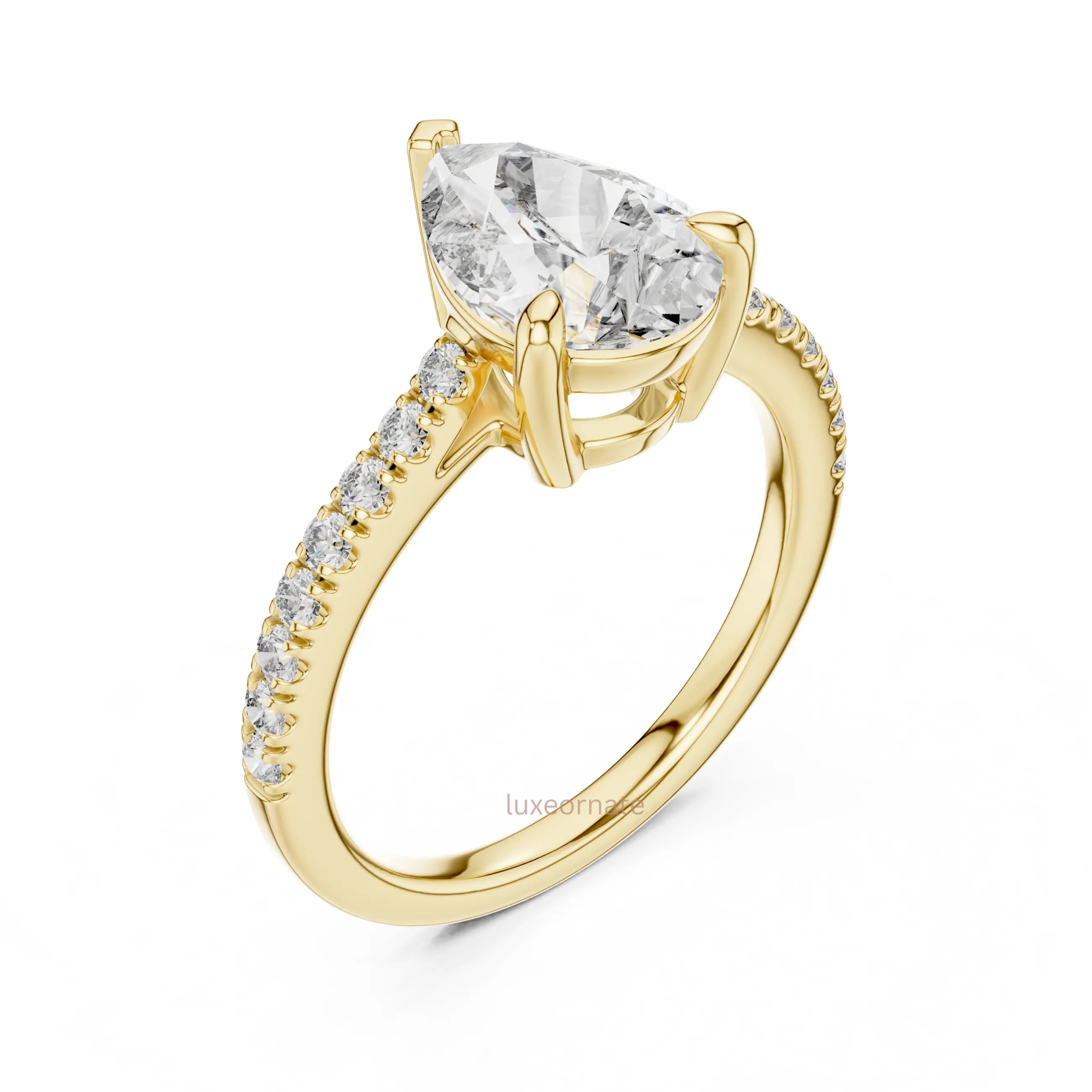 Celebrate timeless romance with this breathtaking Pear Shape Diamond Pave Ring, designed to captivate from every angle. Featuring a radiant pear cut center diamond secured in elegant claw prongs, this ring is perfectly complemented by a shimmering pave set band that enhances brilliance and sparkle.