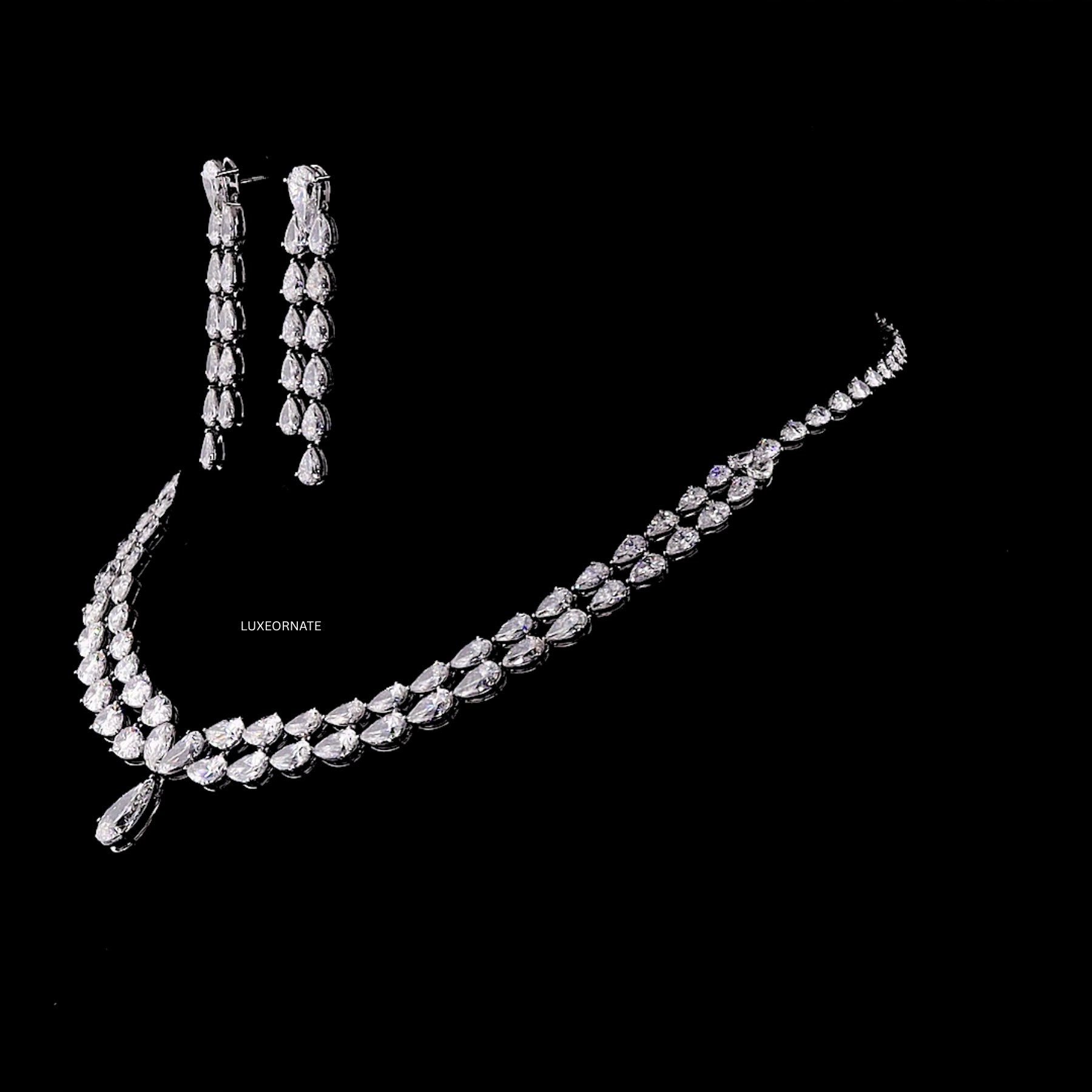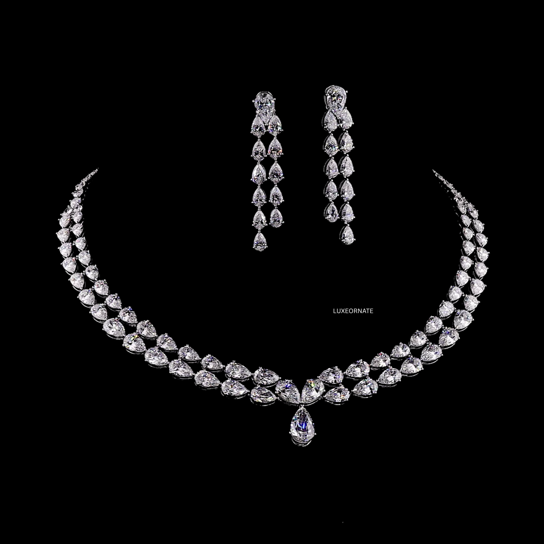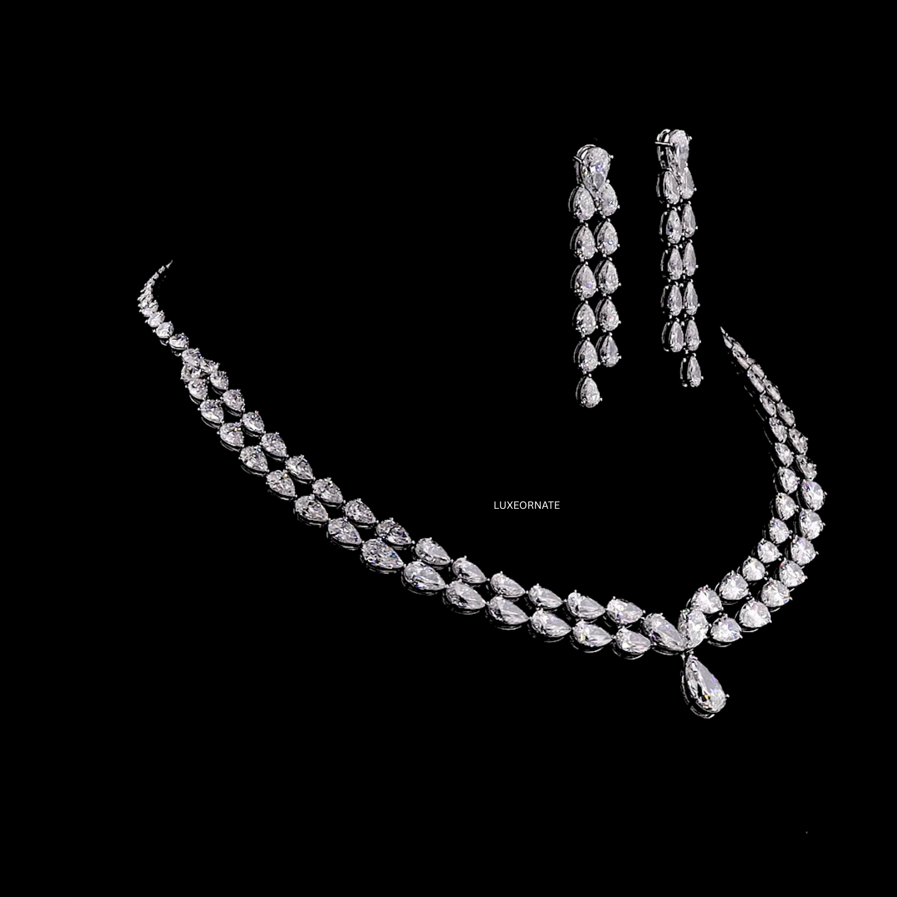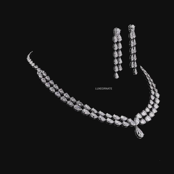 Elevate your elegance with the Shining Pear Cut Diamond Necklace Set, a luxurious creation featuring brilliantly faceted pear shaped lab grown diamonds arranged in a flawless cascading design. This timeless necklace is crafted to reflect maximum sparkle with every movement, paired with long multi drop pear cut earrings that add a stunning touch of sophistication.